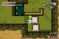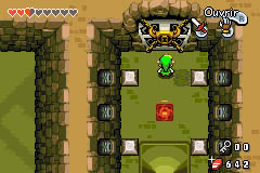 Ressortez en poussant le deuxième bloc de gauche et entrez dans la salle en face de l'entrée. Montez l'escalier et ouvrez la porte de droite avec l'une de vos clés. Tirez la poignée pour faire apparaître un pont qui disparaîtra après quelques secondes; dépêchez-vous donc de le traverser en faisant des roulades. Dans la salle suivante, tuez les trois mains à l'aide de vos flèches (deux coups suffisent) pour faire apparaître une entrée secrète des Minish. Ne l'empruntez pas !