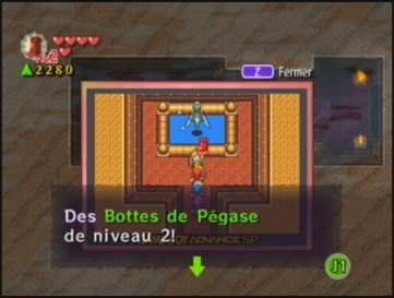 Retournez maintenant améliorer vos bottes en les lançant dans la fontaine des fées précédente à l'Ouest. Une fois les bottes de niveau 2 aux pieds, revenez à nouveau dans la grande salle à l'Est.