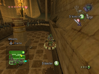 Accrochez-vous au rail jusqu'au sommet, vous pouvez trouver une fée sous un des crânes. Repartez ensuite en sens inverse sur le rail et éjectez-vous directement vers la droite, vous devriez retomber sur une plate-forme au centre avec un second mécanisme pour l'Aérouage. Vous faites monter un nouveau rail qui vous dépose juste en face de la tanière du boss.