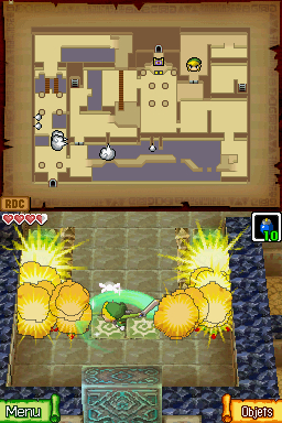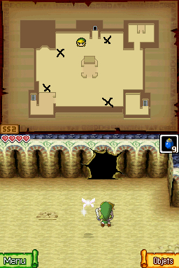 Vous pouvez porter 10 bombes au maximum, mais ce nombre pourra augmenter plus tard dans la partie. Pour les utiliser, équipez d'abord les bombes, touchez l'icône de l'objet (ou appuyez sur L ou R) pour en prendre une, puis lancez la comme un chou péteur pour une explosion similaire. Maintenant, allez dans le coin nord-ouest de la grande salle et utilisez une bombe pour détruire le mur qui est fissuré. Entrez dans l'ouverture ainsi créée.