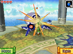 Vous arrivez sur le toit du temple, à l'extérieur. Le boss est une sorte de gros octorok qui flotte dans les airs grâce aux cyclones qu'il contrôle. Remarquez tout de suite sur le sol de l'arène les trois endroits où se forment des cyclones. Lorsque le combat commence, deux de ces cyclones se dissipent; dirigez-vous vers celle qui reste, à l'autre bout de la salle. Poulpatine va alors descendre près du sol et vous fonce dessus. Il se peut aussi qu'il vous attaque avec une tornade qu'il envoie vers vous. Il s'agit de ses deux attaques principales, que vous devez essayer d'éviter.