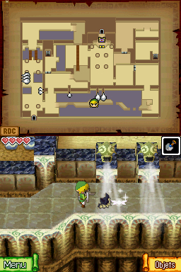 Montez les marches à droite et allez vers le bas jusque de l'autre côté de la passerelle. Descendez les marches, tuez les blobs rouges et tout à gauche, ouvrez la porte du bas en la touchant avec votre stylet. De l'autre côté de la porte, tuez la chauve-souris et activez l'interrupteur pour ouvrir la porte à gauche menant à l'entrée du temple. Prenez maintenant les marches à droite et suivez le chemin étroit en faisant attention au vent qui souffle de travers et aux trous dans le plancher.
