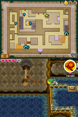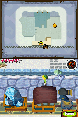 Arrivé au niveau d'un interrupteur, activez-le et dirigez-vous vite vers le pont avant que celui-ci ne disparaisse. Continuez au nord pour trouver Gardeclef. Une fois la conversation terminée, revenez sur vos pas, mais prenez directement à droite en sortant de l'autel pour revenir plus vite au village. Récupérez le contenu du coffre en chemin. Les Gorons vous offrent alors un wagon à marchandises pour votre train! Gardeclef vous demande de ramener quelque chose d'assez froid pour pouvoir faire disparaitre la lave. Rendez vous donc au village Skimo, dans la contrée des neiges. Allez au lac, a l'ouest du village. Le Skimo présent vous demande de l'emmener à un lac. Prenez donc la direction de la Gare du bord du Lac. Arrivé là-bas, vous obtenez une gemme de force. Entrez dans la maison de Ryan et ressortez, pour que le Skimo aie fabriqué ses plaques de glace.