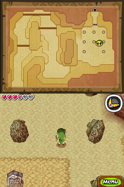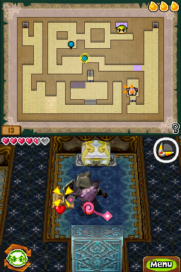 Retournez ensuite à l'étage inférieur. Dirigez-vous ensuite vers le sud-ouest de la pièce, montez sur la plateforme et allez récupérer le contenu du coffre pour obtenir une petite clé. Ouvrez alors la porte munie d'une serrure à votre gauche. Prenez le contrôle de Zelda et téléportez-la à proximité de l'œil spectral au nord. Faîtes-la activer l'interrupteur au sud-ouest et activez vite celui qui se trouve à côté de vous pour ouvrir la porte. Vous pouvez maintenant monter les escaliers au nord-ouest. Parcourez le couloir jusqu'au niveau du sable que Zelda ne peut pas traverser. Placez vous sur l'interrupteur après le sable, et placez Zelda sur celui se trouvant avant pour faire apparaître un pont.