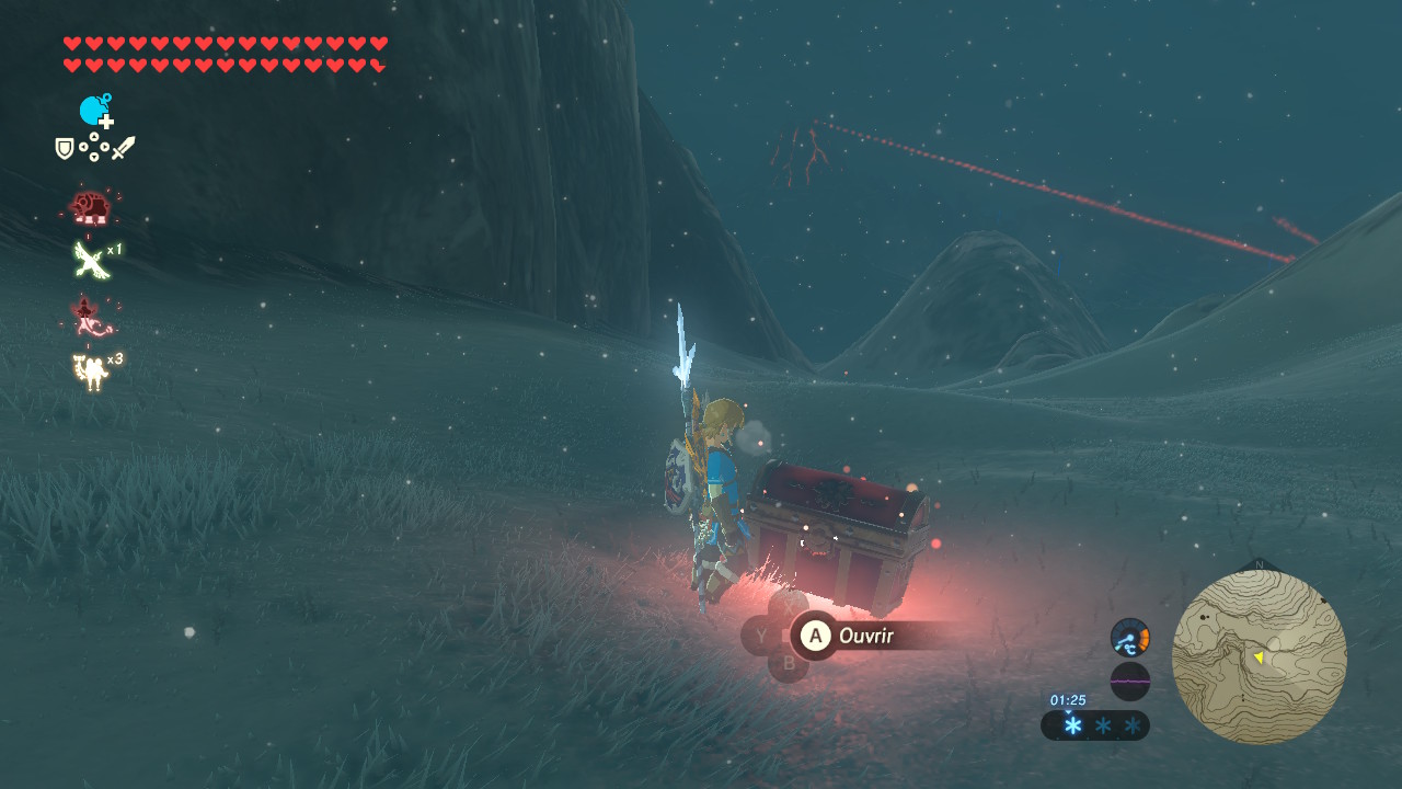 Où ? Pour le deuxième coffre, téléportez-vous au sanctuaire de Tsuna'Kai qui se trouve dans l'œil gauche de l'étang du crâne. De la même façon, attendez la nuit en créant un nouveau feu et attendez qu'une étoile filante tombe en regardant en direction de l'est. Rejoignez l'endroit où elle a atterri, c'est-à-dire dans les alpages d'Akkala, pour découvrir un second coffre rouge contenant le gilet de récupérateur.