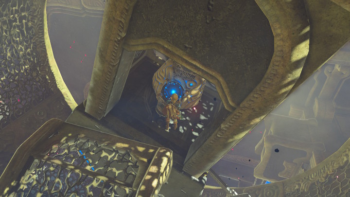 Une fois cela fait, envolez-vous vers le sommet du crâne pour détruire de loin l’œil de corruption afin de déloger le coffre de l’autre côté. Vous pourrez alors vous aider de votre paravoile pour rejoindre ce dernier et obtenir 10 flèches de glace. Profitez de votre position en hauteur pour rejoindre la pièce et le terminal de contrôle qui se trouve dans la tête de Vah’Ruta, délaissant pour l’instant le coffre qui se trouve en dessous.
