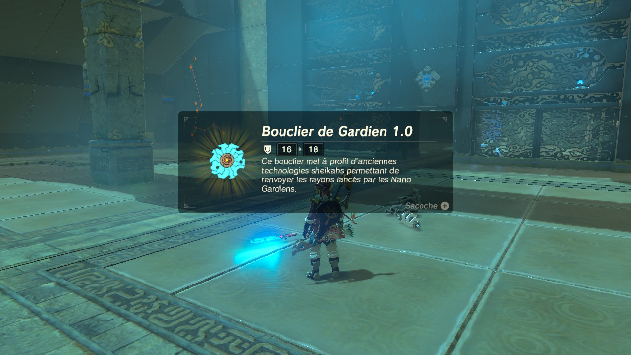 Avant de changer de salle, sortez le coffre qui se trouve au fond de l’eau pour pouvoir l’ouvrir et récupérer un ressort antique. Sortez maintenant de la pièce par le côté pour monter à l’étage du dessus et passer à la pièce suivante. Vous ferez face à un Nano Gardien 2.0. Eliminez-le et récupérez si vous le souhaitez son glaive de gardien. Vous pouvez à présent explorer la pièce. Deux roues se trouvent au milieu de la pièce et chacune d’elle contient un terminal de contrôle.