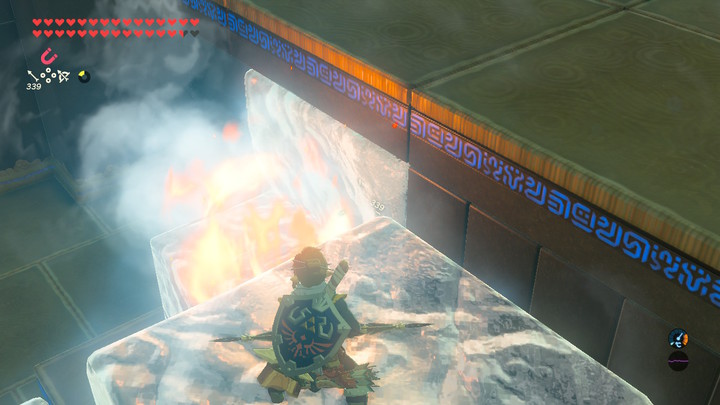 Dans ce sanctuaire, vous devez jouer avec les blocs de glace. Commencez par faire fondre les blocs du fond en faisant attention de ne pas atteindre ceux qui sont sur l’eau. Pour cela vous pouvez vous aider de flèches de feu ou simples si vous vous aidez des torches qui sont déjà allumées.