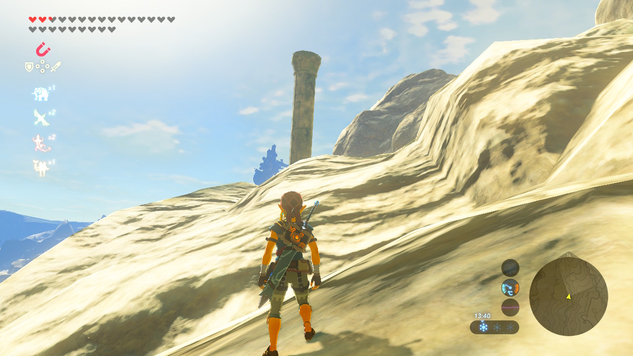 Au sommet de la montagne enneigée au nord du marais des os de dragons, dans une cavité se trouvent des statues positionnées en rond. La coupelle de l’une d’elles est désespérément vide. Posez-y un piment pour faire apparaître un Korogu.