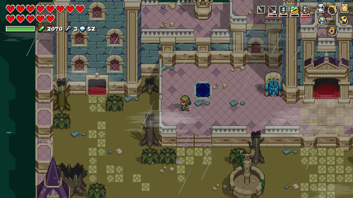 Si vous avez perdu de nombreux points de vie, n'oubliez pas d'activer la stèle de téléportation pour récupérer votre énergie. Déplacez en poussant ou en vous saisissant d'un des deux blocs mobiles pour le placer à côté de la plateforme en hauteur dans la partie est des jardins. Vous n'aurez alors plus qu'à grimper dessus pour rejoindre l'interrupteur qui s'y trouve. En l'activant vous ouvrirez alors les portes de l'aile ouest du château.