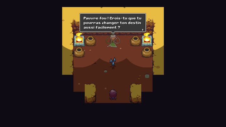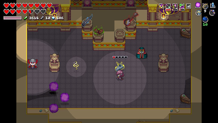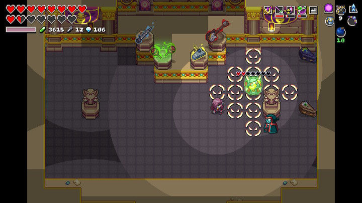 Commencez par détruire les deux orbes en bas de la salle pour faire disparaître la barrière magique du NecroDancer. Ceux-ci sont capables de lancer des boules électriques et possèdent cinq cœurs chacun. Vous pouvez également détruire les ennemis sur votre chemin même si ce n'est pas obligatoire.