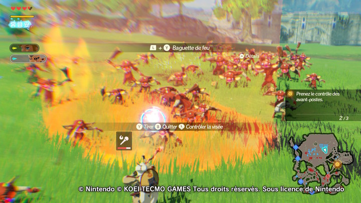 C’est la dernière ligne droite : un groupe de monstre est apparu au sud-ouest, et avec eux trois Moblins. Avec Impa ou Link, dirigez-vous vers eux et, si vous le souhaitez, donnez des instructions au personnage que vous ne contrôlez pas pour qu’il vous rejoigne.