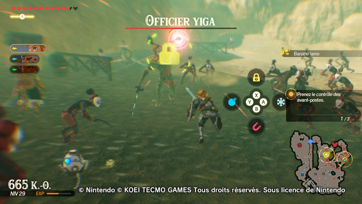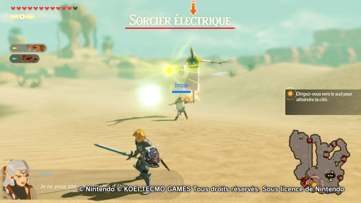 Vous commencez la bataille devant une troupe d’ennemis, guidé par une Capitaine Gerudo. Esquivez ses coups de sabre et venez-en à bout. Vous avez également un Sorcier Électrique qui se promène un peu plus loin, si l’envie vous dit d’aller lui botter les fesses. Une fois vos ennemis défaits, dirigez-vous vers l’avant-poste du sud. Profitez-en également pour vous balader un peu dans le désert, qui sait, vous trouverez peut-être des Korogus !