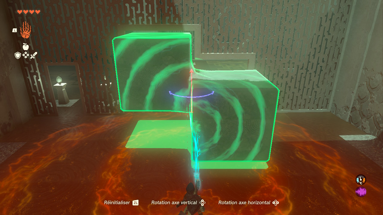 Reprenez les blocs de pierre et tournez-les de sorte à voir une face entière et les trois quarts de la seconde pour que ça rentre dans le trou à gauche de la pièce. Une fois qu'ils sont passés, vous devez les utiliser pour atteindre la fin du sanctuaire. Il n'y a pas de schéma particulier à respecter, mais dans tous les cas vous devez faire en sorte qu'un des cubes soit au niveau du palier ou encore plus haut. Placez-vous alors en-dessous pour utiliser Infiltration. Une fois que vous avez réussi, il ne vous reste plus qu'à récupérer la lueur bienfaisante.