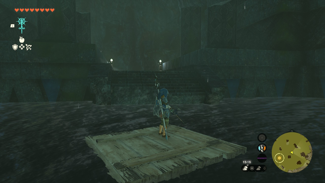 Descendez les escaliers jusqu'à arriver au temple Zora antique. Commencez par détruire les rochers en bas à gauche pour faire monter le niveau d'eau. Vous aurez alors accès au chemin sur la droite. Au bout de celui-ci se trouve une autre canalisation en hauteur. Détruisez à nouveau les rochers. Vous pouvez alors continuer votre chemin en récupérant au passage le coffre en bois contenant un bouclier zora.