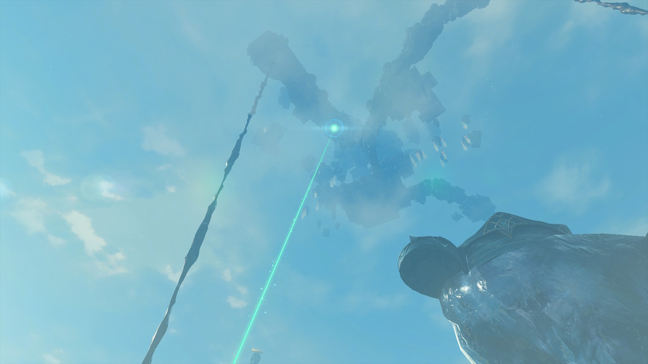 Évitez la vase et montez au sommet de l'île céleste. Regardez ensuite vers le sud-ouest pour que l’alignement des pierres flottantes forme une goutte. Tirez une flèche amalgamée avec une écaille royale pour que la goutte canalise toute la puissance et crée une colonne de lumière.