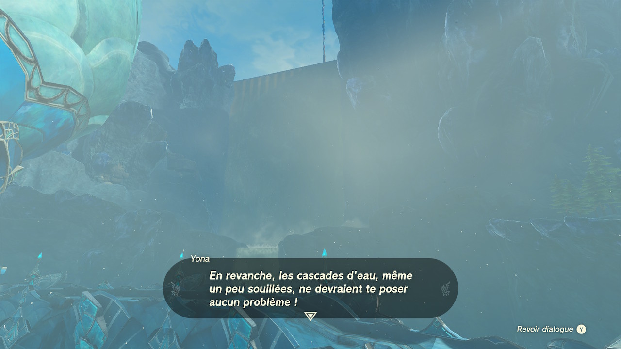 Équipez-vous de l'armure zora et dirigez-vous vers la première cascade à votre disposition. Sachez que si vous planez jusqu'à une cascade, vous remonterez automatiquement cette dernière sans avoir à appuyer sur un bouton. Très vite, vous arrivez au parc Mipha.