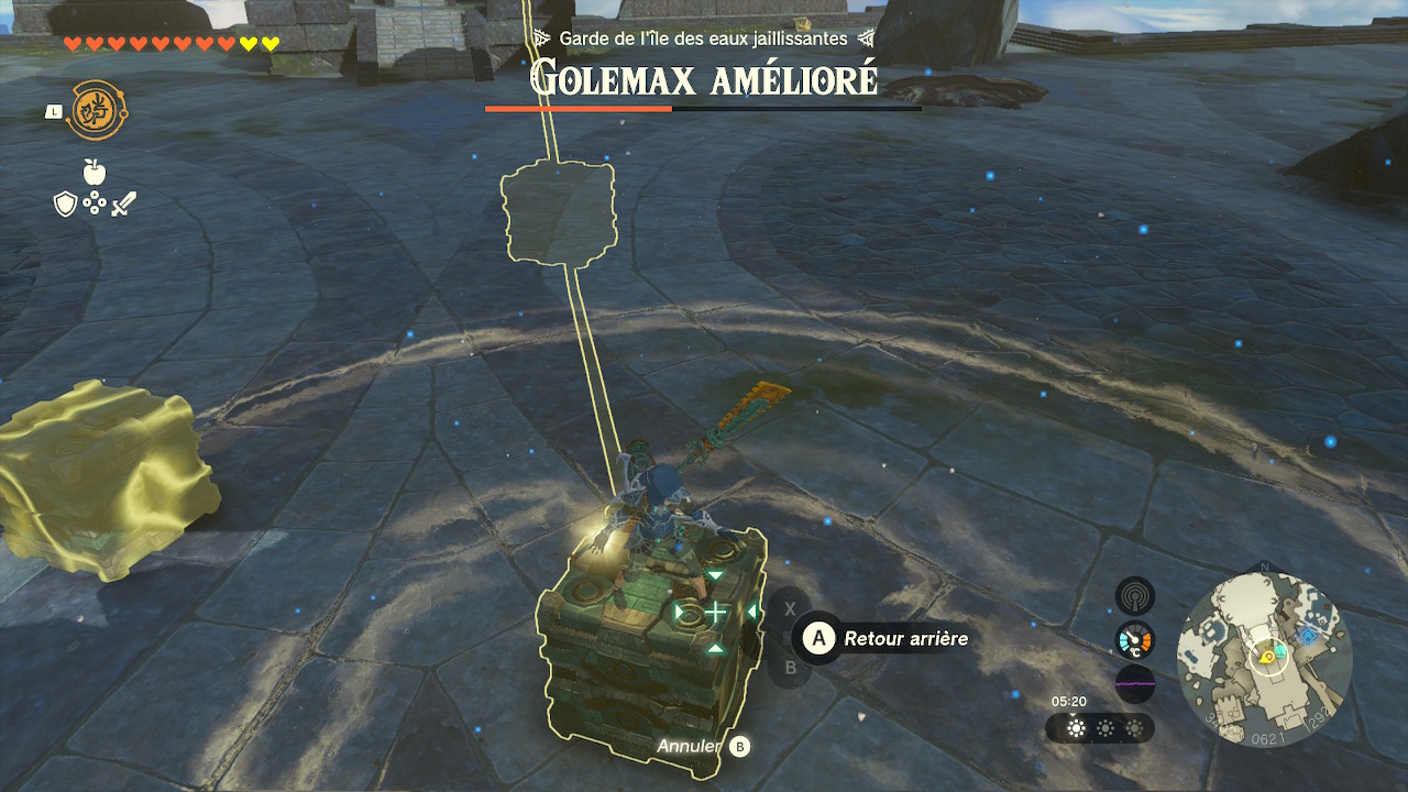 Si c'est la première fois que vous affrontez un Golemax, sachez qu'il possède un unique point faible : le cube lumineux. Sur cette île, vous pouvez profiter de la pesanteur réduite pour tirer des flèches en mode ralenti pendant un de vos sauts.