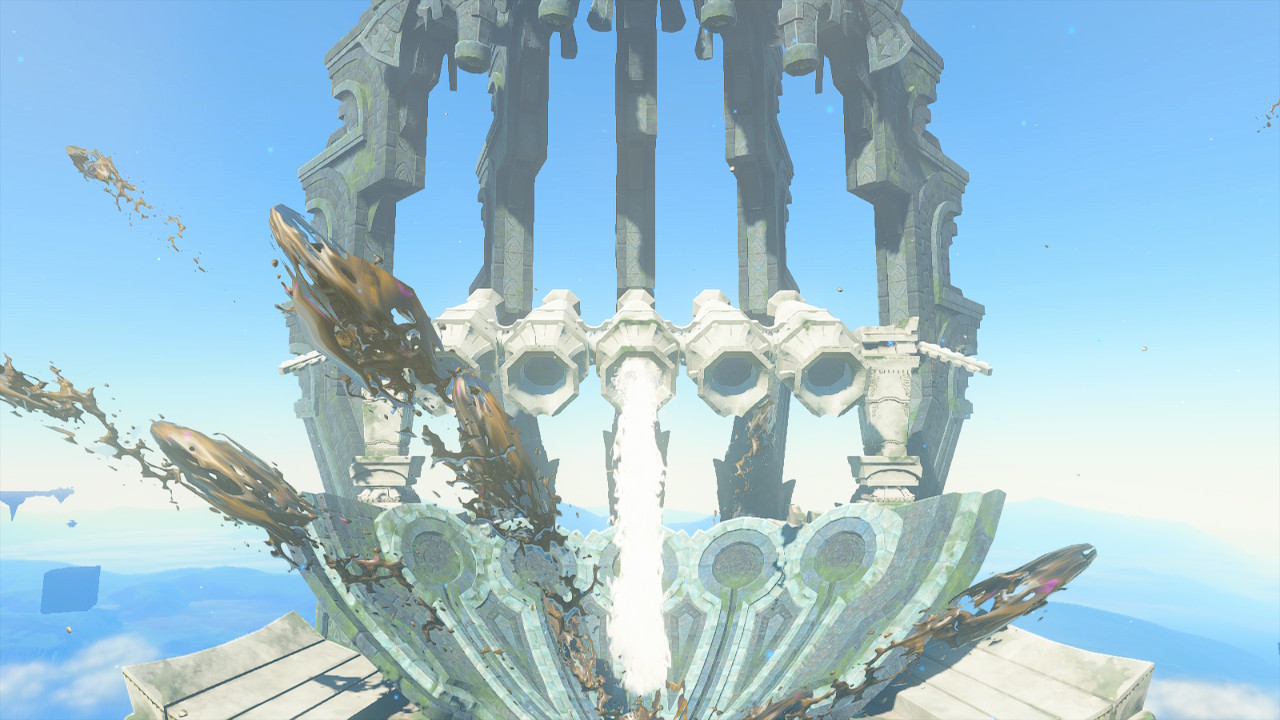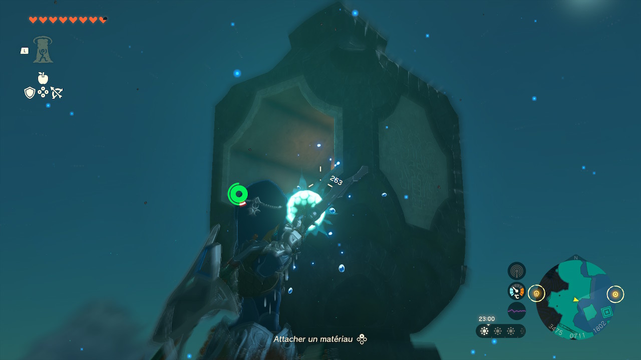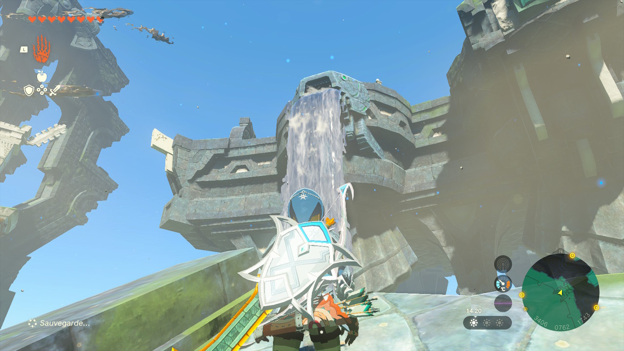 De l'autre côté de cette plateforme, dans le coin sud-est, un générateur de bulle d'eau a besoin d'aide pour vous envoyer vers l'îlot céleste un peu plus haut. Utilisez la plaque et la plateforme lévitante pour créer une pente qui dévie le trajet de la sphère aquatique. Quand vous êtes sûr de votre coup, grimpez dans une bulle et attendez qu'elle s'élève. Lorsqu'elle est suffisamment haute, planez jusqu'à la plateforme pour atteindre le coffre. Vous obtiendrez un grand orbe d'énergie soneau.