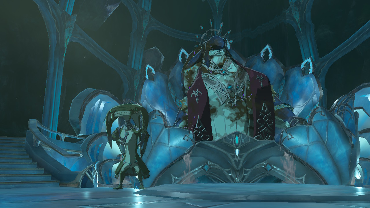 Une fois vulnérable, courez vers lui pour l'attaquer et lui infliger le plus de dégâts possible. Au bout d'un moment il s'enfuit à l'autre bout de la pièce et en profite pour se métamorphoser à nouveau en requin. Profitez de ce moment pour lui envoyer une flèche élémentaire pour ne lui laisser aucun répit.