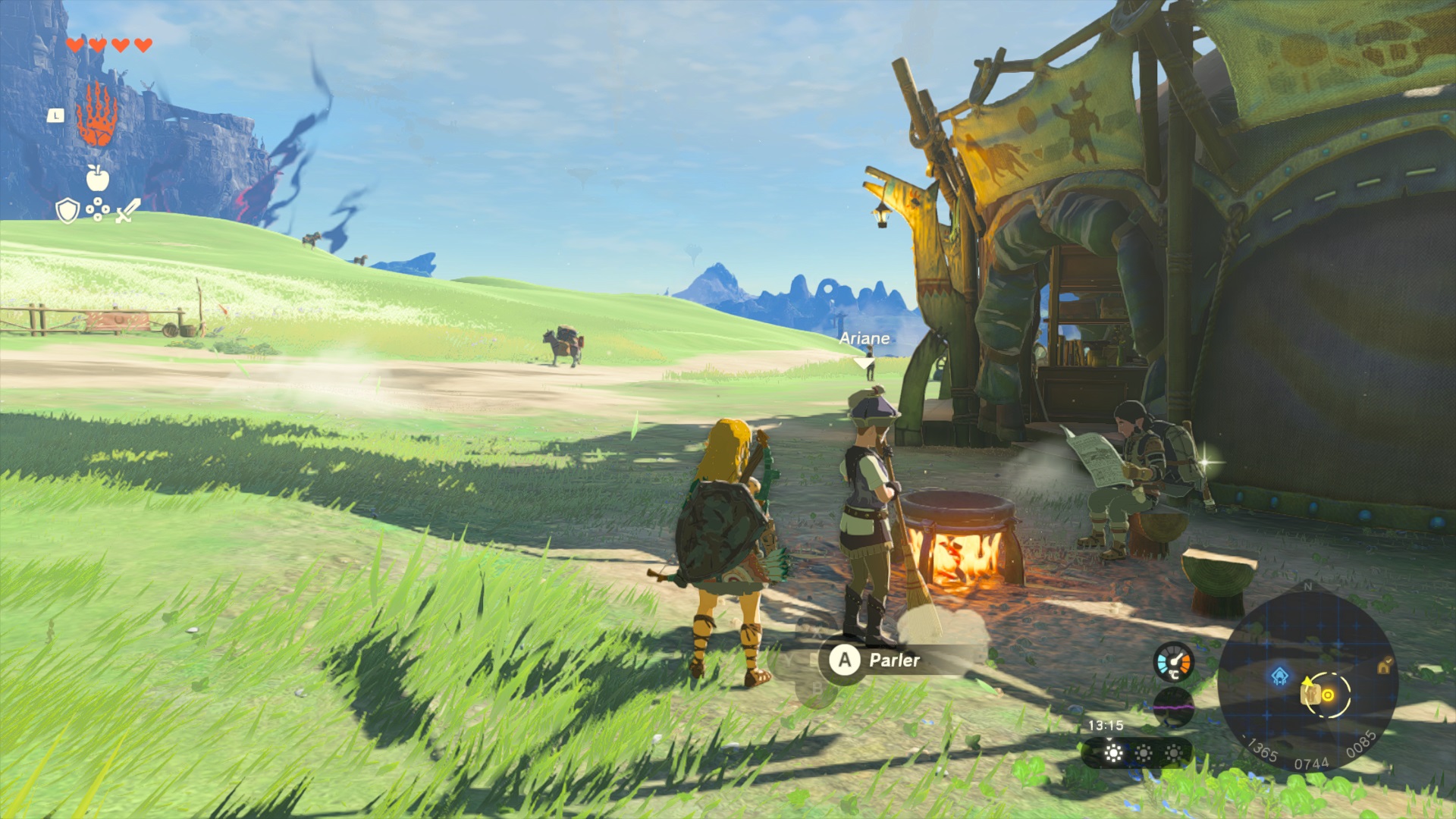 Enfin, approchez-vous du Sheikah qui s'appelle Vocah et qui surveille l'horizon avec son âne, devant le relais. Il vous recommande d'aller voir dame Impa. Elle aurait peut-être des informations qui pourraient aider à trouver la princesse Zelda. La vieille Sheikah vous attend un peu plus loin, allez la rejoindre. Elle vous parle de géoglyphes apparus aux quatre coins du royaume, et vous explique que le motif qu'ils dessinent se voit mieux du ciel. Elle vous demande alors de l'aide pour réparer sa montgolfière. Saisissez le ballon avec Emprise, et fixez-le au sommet de la structure. Si vous avez commencé la quête de Faras, vous aurez alors déjà appris le plan de la montgolfière qui vous facilitera la reconstruction avec Duplicata. Parlez à Impa pour qu'elle embarque, puis enflammez le brasier afin que la montgolfière s'élève.