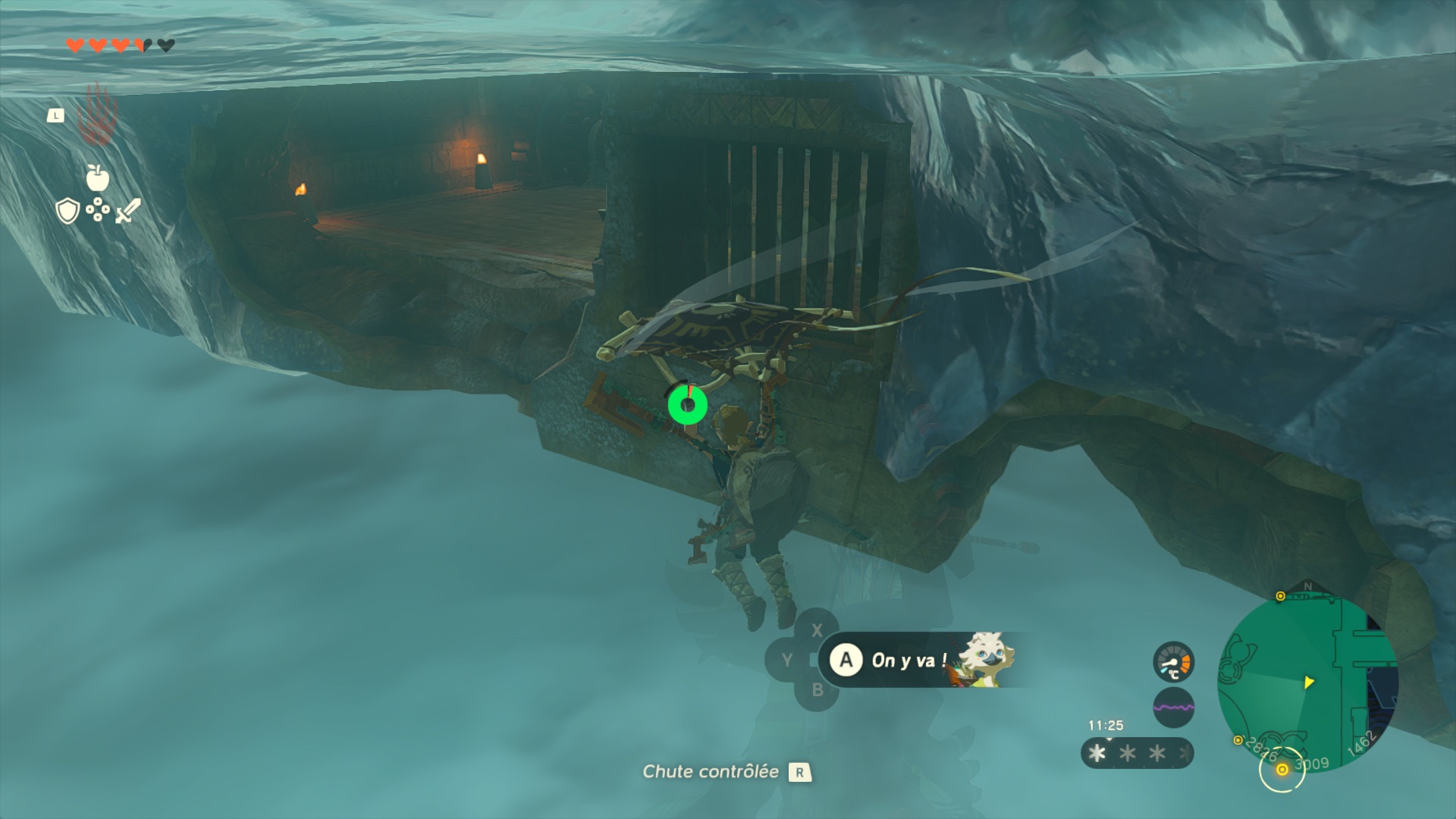 Sur votre gauche se trouve un coffre derrière une grille. Si vous utilisez Emprise, vous verrez qu'il est attrapable, mais hors de portée. Faites tomber d'une flèche les deux stalactites autour de la grille, et fixez les extrémités entre elles. Utilisez ce bâton improvisé pour attraper le coffre. Une fois assez près, utilisez Emprise, directement sur ce dernier, faites le passer par le petit trou dans la grille et emparez-vous du Saphir brut à l'intérieur.