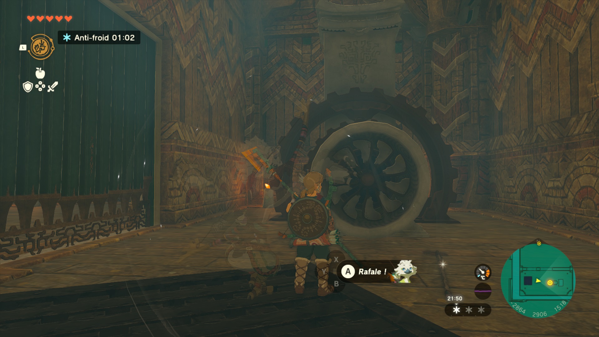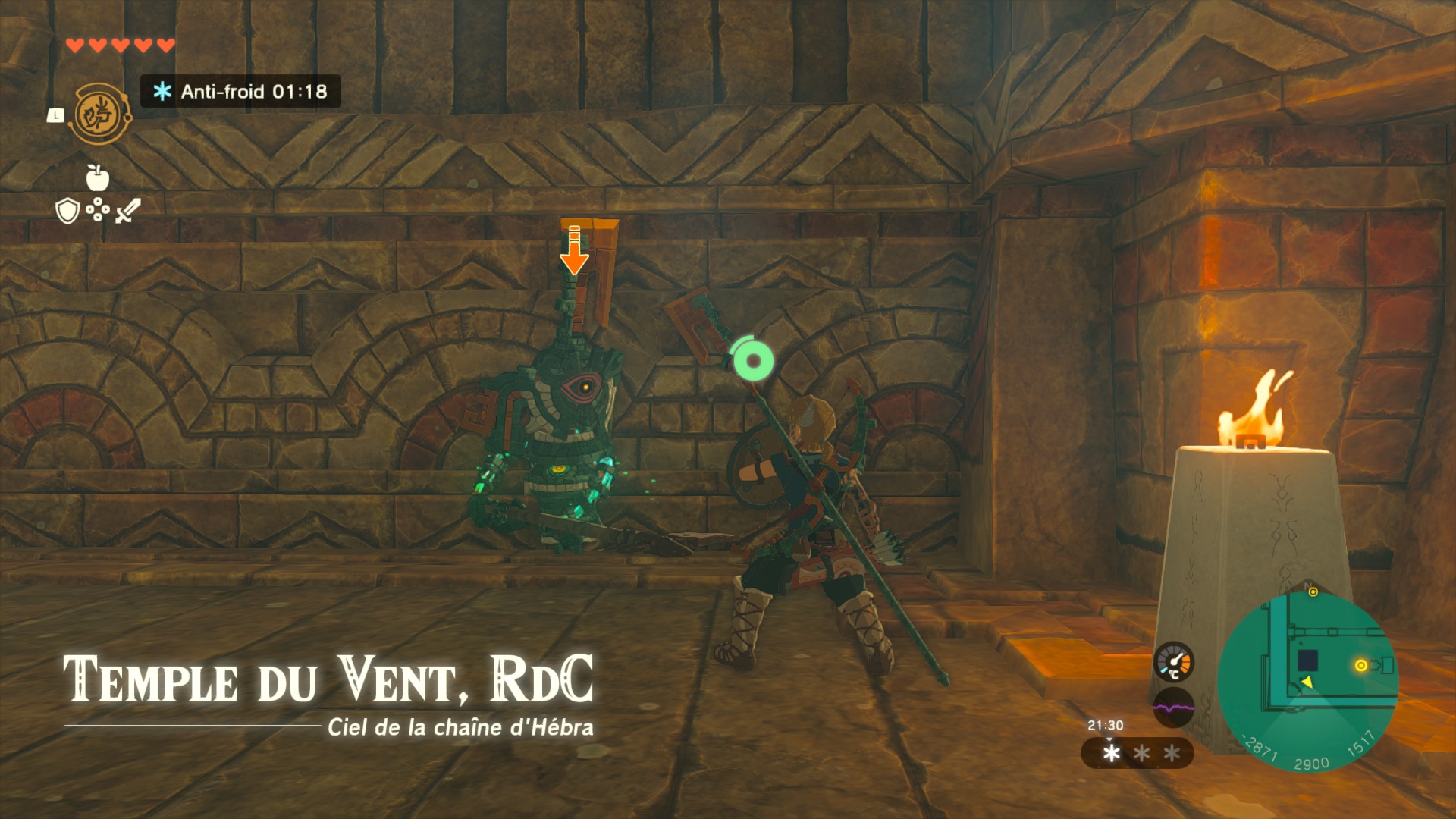 Continuez vers le sud. Devant vous un petit trou, que vous devez franchir. Sautez, déployez votre paravoile et demandez à Babil de vous propulser vers l'avant. Soyez rapide, et vous devrez franchir le vide sans encombre. De l'autre côté, activez l'interrupteur sur la droite à l'aide d'Emprise. Gravissez les quelques marches à gauche et détruisez le Golem lieutenant. Attention, il tentera d'utiliser un rubis contre vous, si vous le laissez faire, le résultat sera dévastateur.