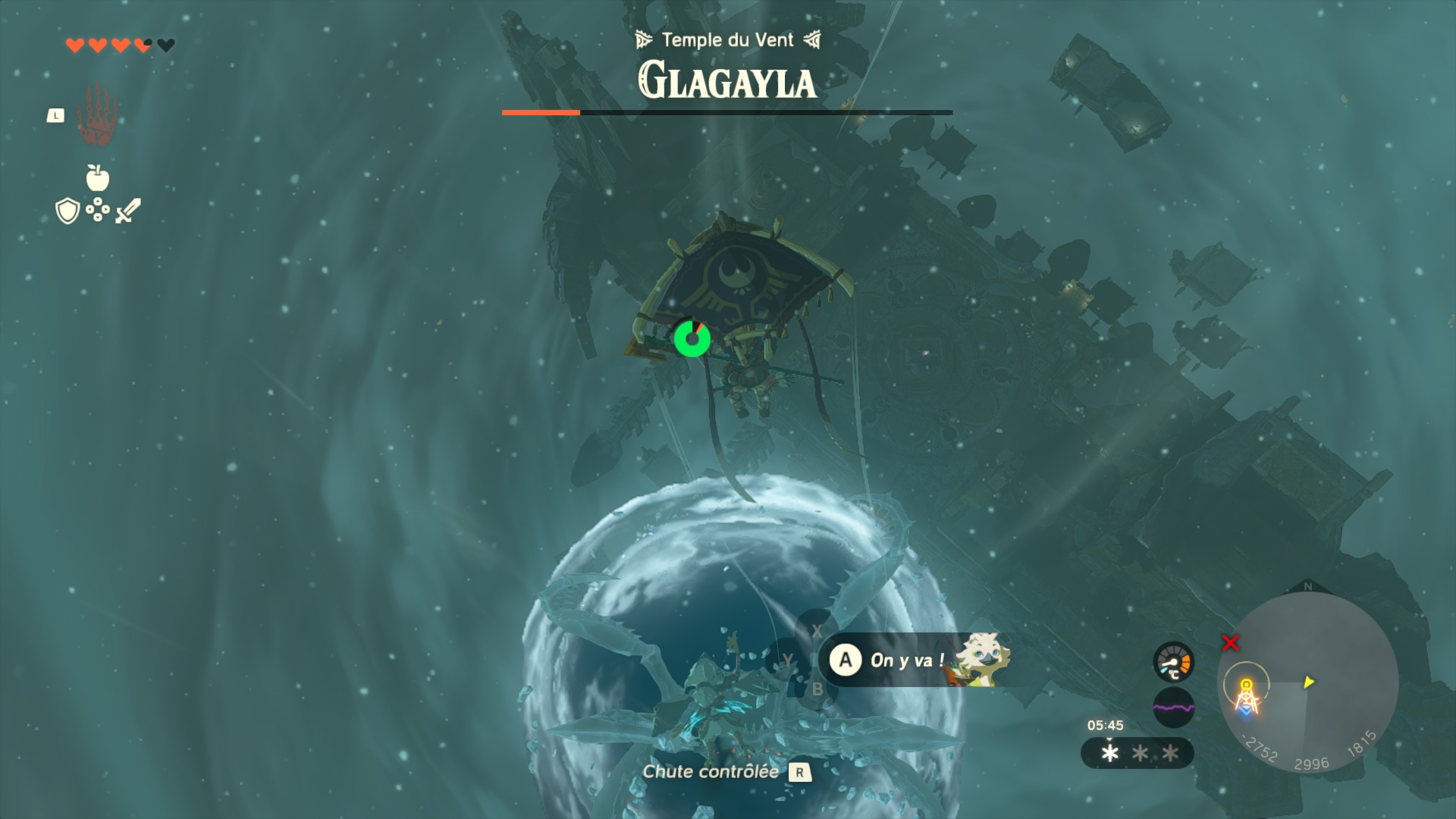 Revenez maintenant à l'entrée. Le plus simple est de vous téléporter, mais vous pouvez aussi faire le trajet à pied pour profiter de la musique. Activez l'interrupteur pour voir l'écoutille s'ouvrir. Mais un puissant courant d'air vous propulse, vous et Babil, haut dans les cieux avant de voir un énorme monstre en sortir : Glagayla