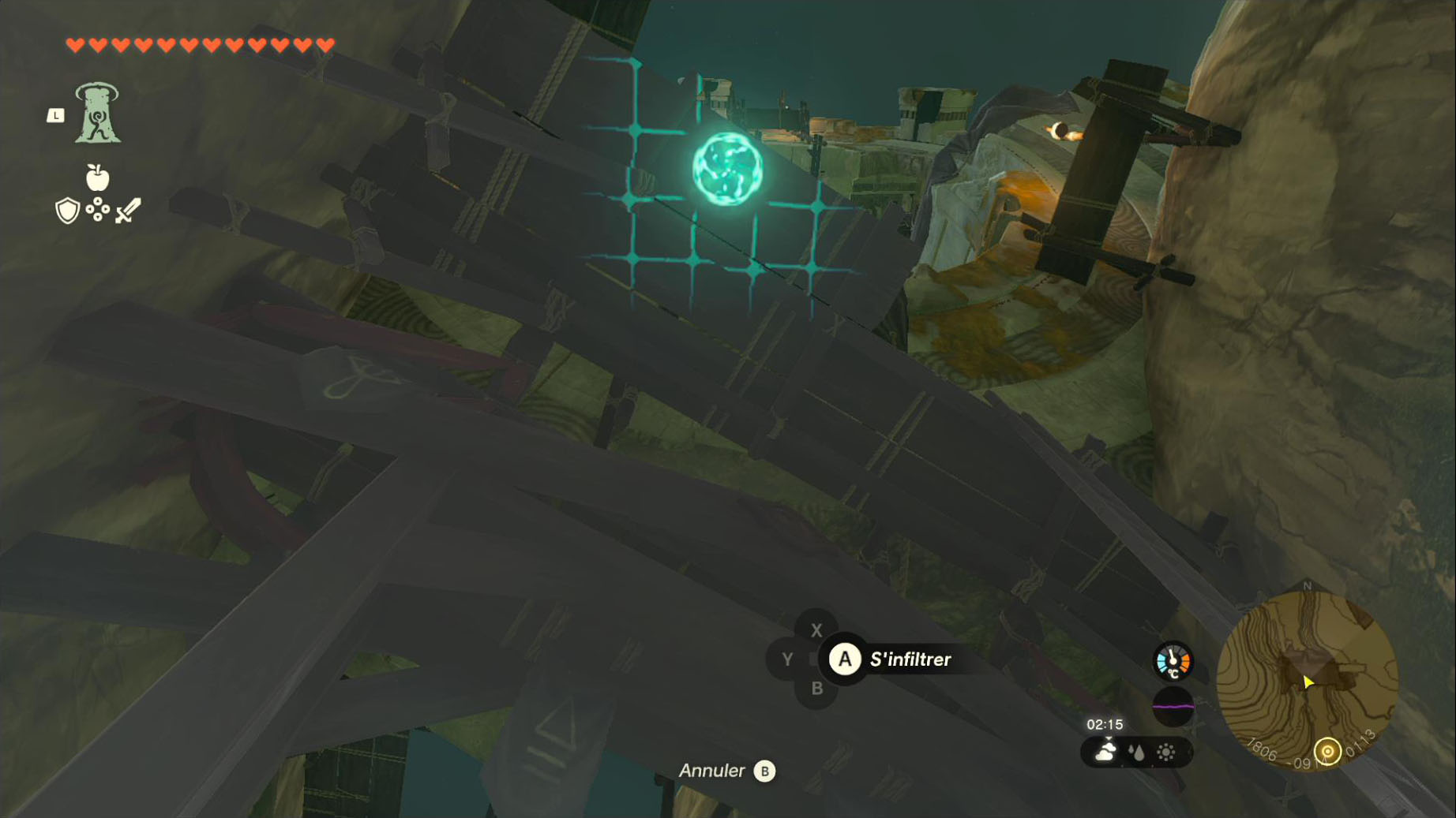 Vous pouvez voir la fin du sanctuaire face à vous, de l'autre côté du gouffre. N'essayez pas cependant de reproduire la stratégie précédente pour le moment, la plate-forme est trop petite. Déplacez-la plutôt sur la gauche, pour rejoindre la sphère. Pour l'envoyer au niveau de l'interrupteur, vous allez construire une catapulte. La coupole est déjà bien placée, fixez plutôt le stabilisateur de l'autre côté de la grille. Posez la boule sans la fixer dans la coupole, puis activez l'artéfact soneau. La sphère va s'envoler et atterrir dans l'interrupteur. Retournez ensuite la catapulte vers le mur, et utilisez-la pour vous propulser vers la plateforme en hauteur où se trouve un coffre. Il contient un élixir féérique.