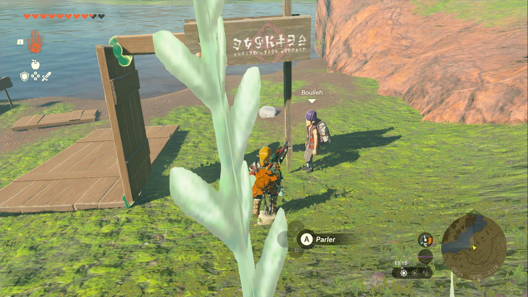 Coordonnées : -0333 1344 0009Sur la rive nord, au nord du château d'Hyrule, repérez sur la carte un embarcadère. À côté, vous trouvez Boulieh qui a besoin d'aide. Commencez par assembler de grandes planches pour former un socle solide puis ajoutez une planche assez large, comme une planche carrée, à la verticale installée dans l'échancrure de la pancarte. Faites-le lâcher et il vous remerciera d'un rubis rouge, des boulettes aux herbes solaris et un bon pour une nuit gratuite.
