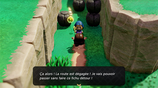 Longez le lac et descendez au sud-est pour voir un Hylien qui voit son chemin bloqué par des rochers et des caisses. Parlez-lui pour qu'il vous apprenne qu'il s'agit d'un raccourci vers le ranch. Commencez par détruire les caisses en lançant par exemple un Lumizol ou utilisez la synchronisation de Tri pour pousser les rochers. Vous n'avez alors plus qu'à pousser l'un des deux rochers à gauche assez loin pour libérer le passage. Le villageois vous récompense alors en vous offrant un rubis rouge.