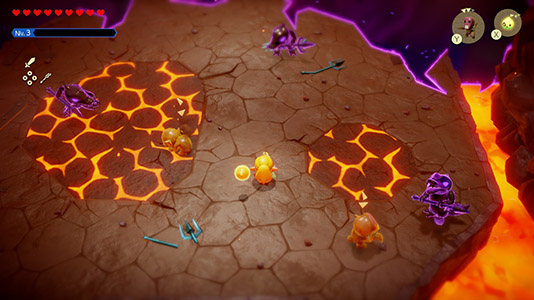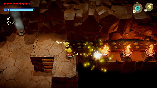 Vous arrivez dans un passage en vue de côté, parsemé de zone de lave. Avancez-vous sur la première plateforme et posez une roche de lave devant vous. Montez dessus, et attendez d'être en hauteur, projetée par le jet de lave pour sauter de l'autre côté. Continuez vers l'est, et placez une nouvelle roche de lave devant vous. Attrapez ensuite la plateforme devant vous grâce à Tri et ramenez-la au milieu du lac de lave. Grimpez dessus, posez une nouvelle plateforme devant vous et traversez enfin ce deuxième bassin.