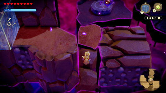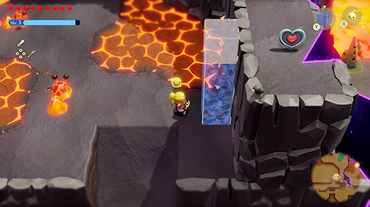 Dans la nouvelle salle, utilisez de nouveau une Chauve-souris pour planer au-dessus de la lave. Utilisez les courants ascendants pour vous élever et rejoindre la zone en hauteur. Si vous ne l'avez pas encore, vous pourrez apprendre l'écho de la roche de lave, qui vous permet de créer des plateformes sur la lave. Utilisez ce dernier pour traverser et rejoindre la sortie nord. Avant de partir, créez un pont avec des cubes d'eau pour rejoindre le coffre sur la droite pour obtenir une pierre de monstre.