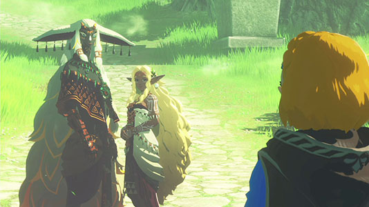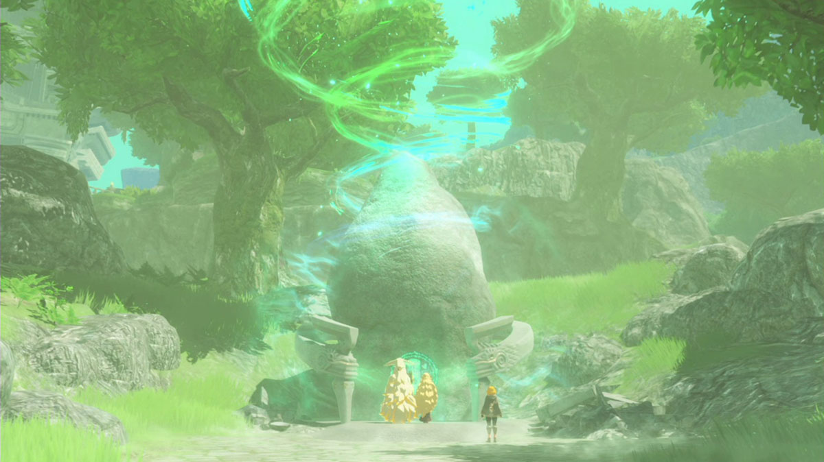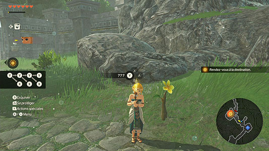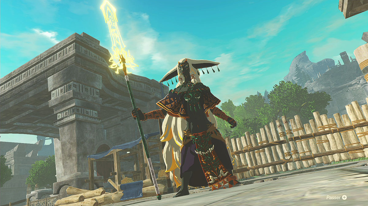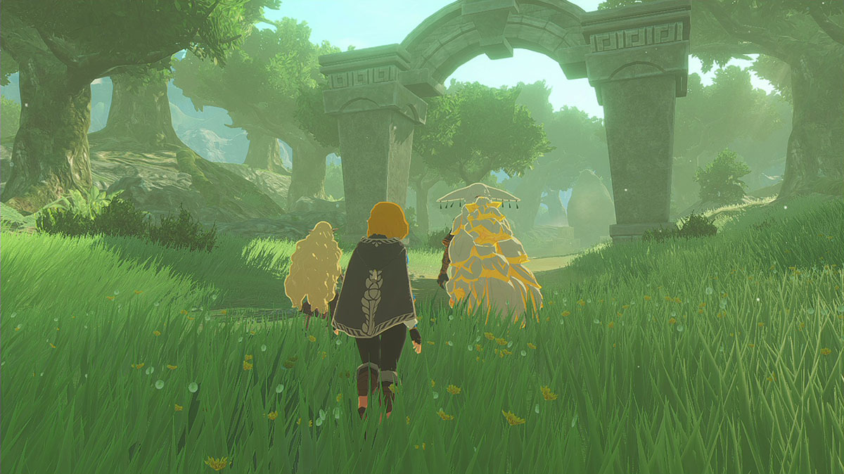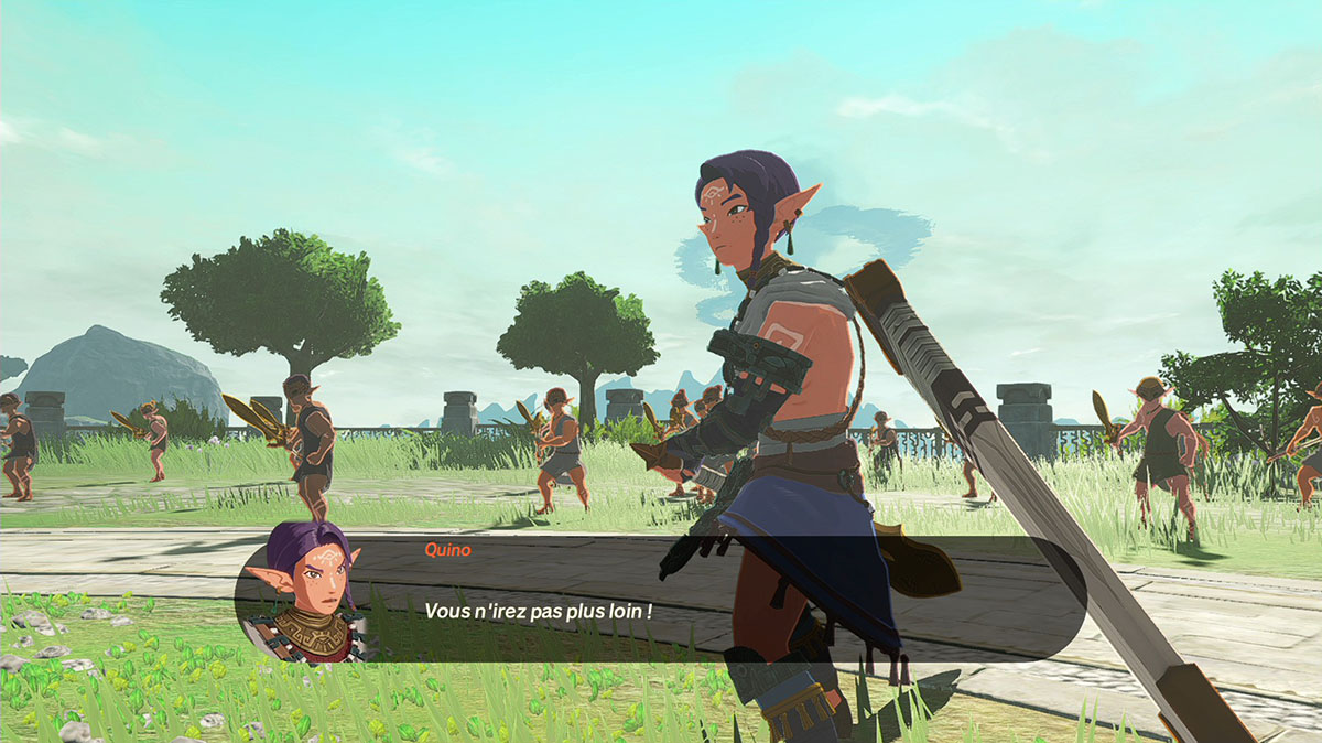 Après la cinématique d’introduction revenant sur les évènements introduisant l’histoire de Tears of the Kingdom, vous vous retrouvez avec Sonia et Rauru. Suivez-les jusqu’à leur escorte tout en prenant connaissance des premières commandes du jeu.