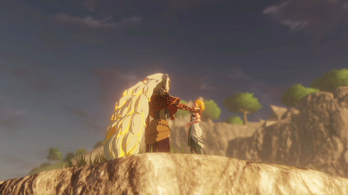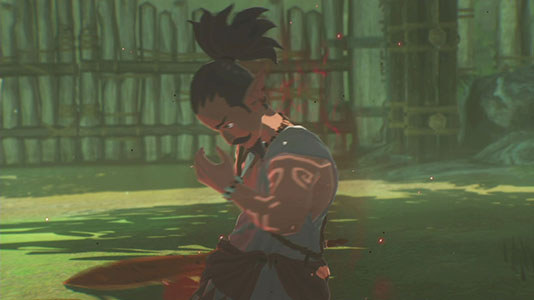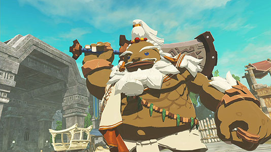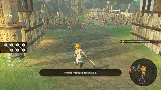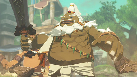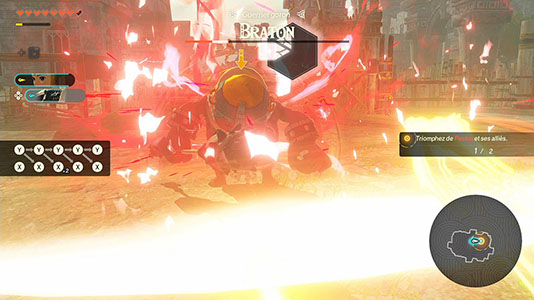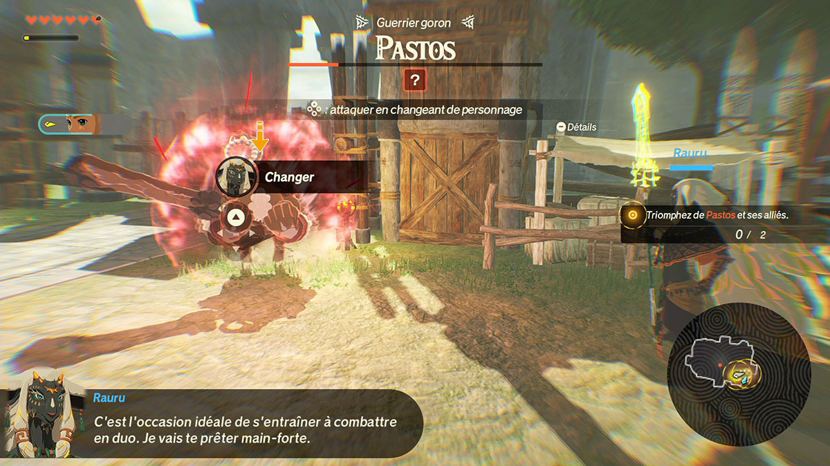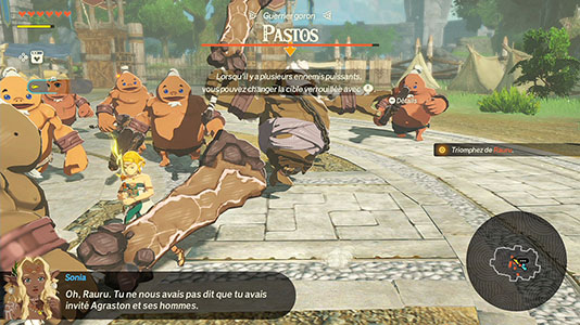 La scène suivante introduit le chef des Gorons : Agraston. Les Gorons se joignent à votre entraînement, en tant qu’ennemis bien sûr ! Le tutoriel vous apprend comment changer de cible quand plusieurs ennemis puissants sont dans la zone, en l’occurrence Braton et Pastos. Lorsque Pastos commence à charger une attaque puissante, le jeu vous invite à changer de personnage : vous vous retrouvez ainsi aux commandes de Rauru. Utilisez ses techniques puissantes de la même manière qu’avec Zelda et vous n’aurez aucun mal à aplatir Pastos et Braton.