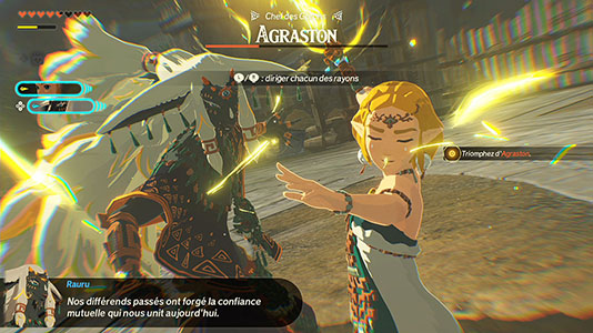 Agraston entre alors en jeu. Faites attention à ses coups puissants et attendez quelques secondes lorsqu’il se met en boule et se teinte d’une aura rouge pour savoir si l’attaque va être une charge ou une attaque sautée, afin de contrer avec l’action spéciale adéquate. N’oubliez pas d’utiliser vos attaques synchro lorsque votre jauge et celle d’un allié est pleine pour venir à bout du Goron.