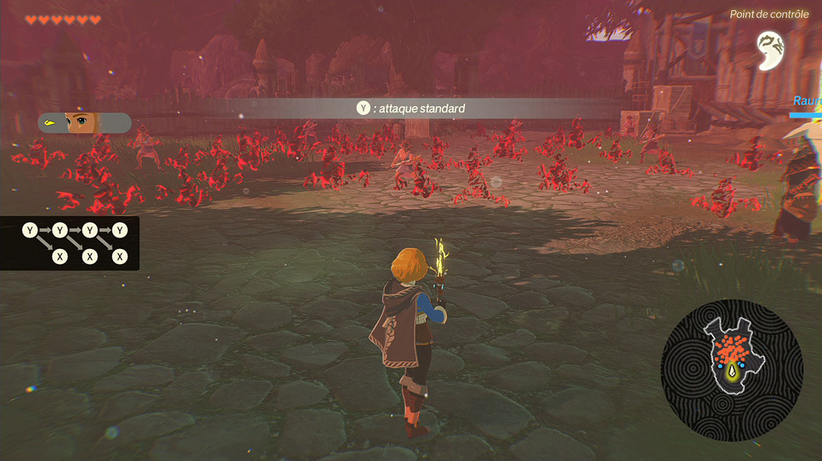 Alors que votre cortège vous raccompagne, vous faites connaissance avec les Affres, des créatures spectrales qui semblent pouvoir posséder les habitants d’Hyrule, et vous obtenez votre première arme équipant Zelda. Suivez de nouveau le tutoriel pour apprendre les commandes de combat et vous débarrasser des monstres. Suivez ensuite de nouveau Sonia et Rauru jusqu’au château d’Hyrule.