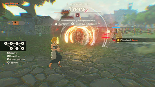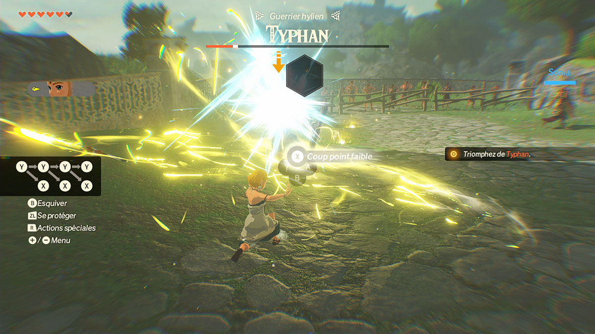 Après les cinématiques qui introduisent, entre autres, Lenalia et Mineru, c’est l’heure de votre premier entraînement avec les soldats d’Hyrule. Vous affrontez d’abord Typhan et ses hommes. Suivez le tutoriel pour apprendre les commandes de Techniques individuelles et affaiblir Typhan pour pouvoir vider sa jauge de point faible avant de lui asséner un coup point faible. Typhan s’apprête alors à asséner lui-même une attaque puissante, ce dont une aura rouge vous avertit. Suivez le tutoriel pour le contrer avec l’action spéciale appropriée. Vous pouvez aussi l’esquiver, cela fera apparaître dans tous les cas sa jauge de point faible. Poursuivez le combat jusqu’à le vaincre. Vous avez la possibilité de recommencer le combat autant de fois que nécessaire pour bien assimiler les commandes de combat. Poursuivez et Sonia vous donnera un premier objet : une ration spéciale.