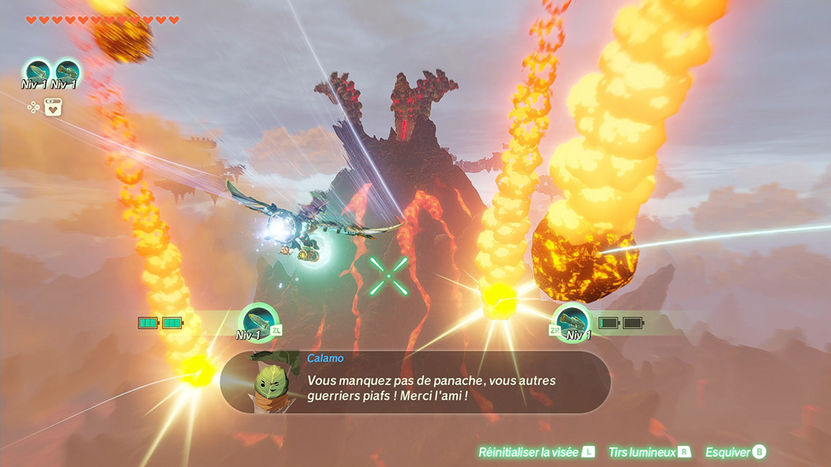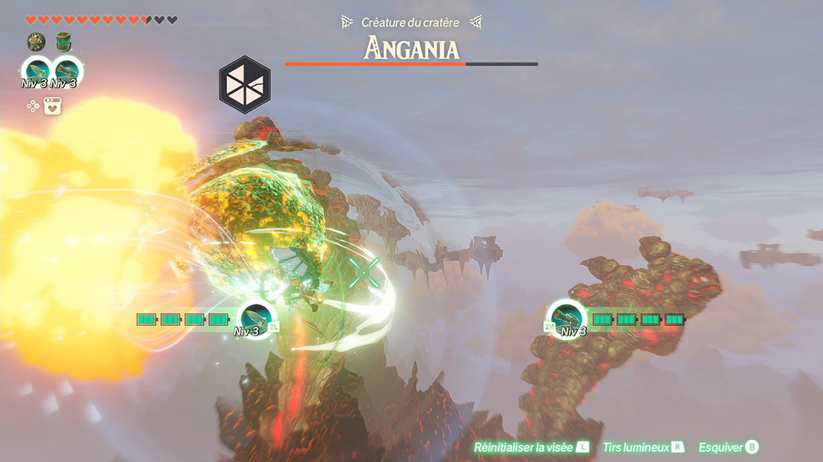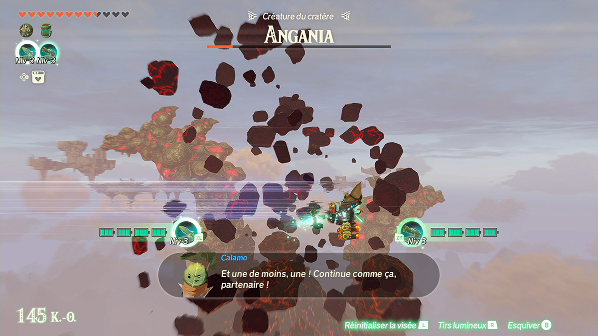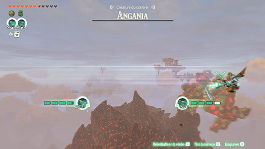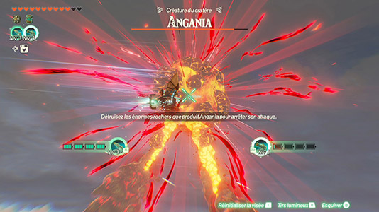 Vous longez ensuite le flanc de la montagne en vue de trois-quart : visez les ennemis tout le long du chemin, principalement avec le canon, pour les abattre. Gare à bien passer sous les falaises qui vous sont signalées par un gros point d’exclamation sur la droite de votre écran. Briser les pans de montagne fragilisés peut vous rapporter des batteries supplémentaires pour vos armes. Ensuite, vous entamez une réascension vers le cratère : le combat contre Angania peut commencer.