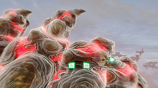 Comme indiqué par le tutoriel, vous pouvez renvoyer les projectiles que chaque tête vous crache en esquivant au dernier moment. Une fois les projectiles renvoyés, vous pouvez viser les points faibles de la tête en cours avec le propulseur pour y envoyer quelques missiles. Une fois passées devant les trois têtes, celles-ci se mettent de concert à créer un immense rocher au-dessus d’elles : visez-le avec toutes vos armes pour le détruire avant qu’il ne soit projeté vers vous. À ce moment vous pouvez déclencher un coup point faible à la créature avec X puis en appuyant de manière répétée sur Y. Ensuite, le combat reprend comme au départ, face à chacune des têtes puis leur attaque spéciale. Poursuivez vos efforts jusqu’à ce que les trois têtes d’Angania soient détruites.
