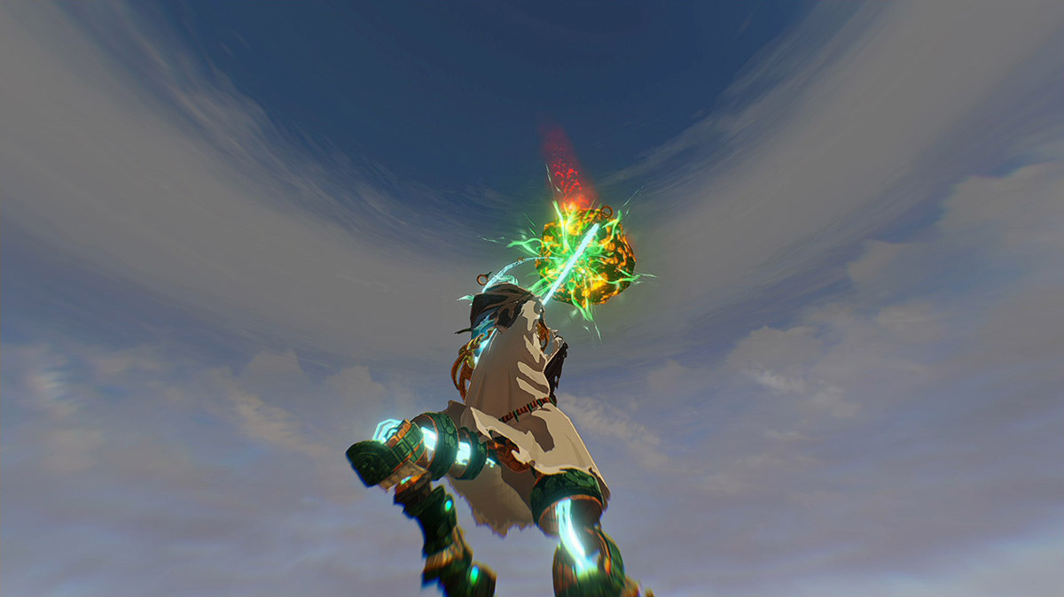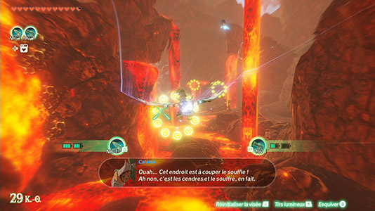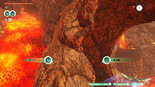 Vous plongez alors en piquée pour rejoindre le flanc de la montagne, où les choses sérieuses commencent. Quelques ennemis apparaissent sur votre chemin. Débarrassez-vous donc d’eux avec vos armes diverses. Après être passé sous une vague de lave, vous verrez une série de trois cercles lumineux : passez à travers chacun d’eux pour révéler un Korogu qui vous gratifie d’une recharge d’énergie et d'une noix korogu. Brisez immédiatement après le mur de pierre qui arrive très vite devant vous avec votre canon.