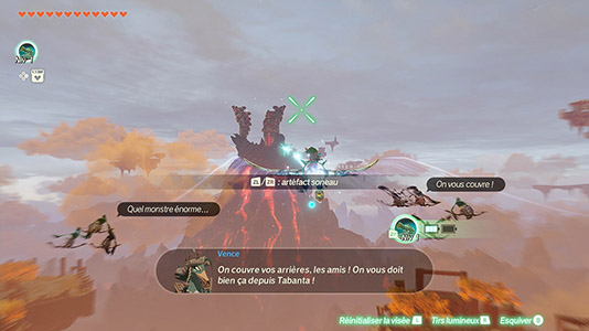 Vous débutez sans artéfact soneau à disposition, commencez donc à faire des tirs simples en rafale sur les quelques chauves-souris de feu qui passent dans votre ligne de mire. Vous récupérez très vite un canon comme arme droite, puis un propulseur comme arme gauche, alors que les guerriers Piafs passent devant vous pour vous couvrir contre les boulets enflammés que crache le titan du cratère. Esquiver tout de même les quelques boulets qui pourraient vous atteindre.