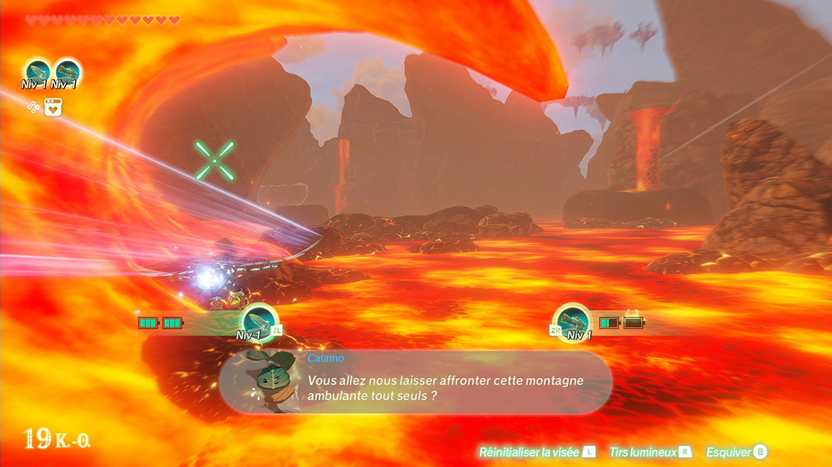 Lorsque la dernière tête sera au bout de sa vie, déclenchez l’action Enchainer avec X. Attention, il se peut que l'indication ne s'affiche pas. Vous vous retrouvez face à la dernière tête et deux colonnes de lave s’élèvent de chaque côté sur votre chemin. Détruisez les Magrok qui s’y trouvent et évitez leurs projectiles. Une fois près de la dernière tête, celle-ci tente de vous asséner un coup avec son cou : vous pouvez appuyer sur ZR et ZL comme indiqué à l’écran pour asséner le coup de grâce !
