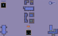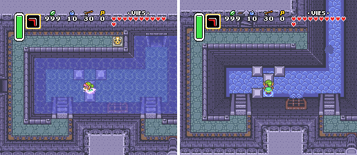 Retournez maintenant dans la salle du grand coffre. Reprenez la porte au Sud-Ouest et, nagez sur la gauche maintenant que l'eau a inondé le secteur. Avancez vers la gauche et rejoignez les petits blocs ; poussez celui du bas vers la gauche et celui du centre vers le haut pour dégager la voie vers l’escalier menant à l'étage supérieur.