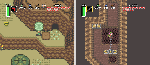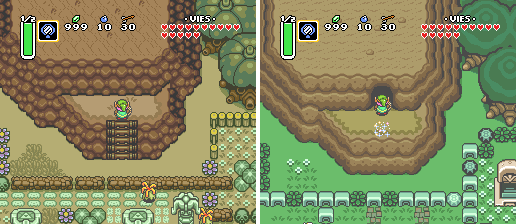 Quittez ensuite le tombeau et retournez dans le Monde des Ténèbres. Avancez alors au Nord de la zone en fonçant dans les tas de pierres qui bloquent le passage pour les détruire. Montez l'échelle qui semble mener nulle part et utilisez le Miroir pour atteindre une grotte inaccessible du Monde de la Lumière.
