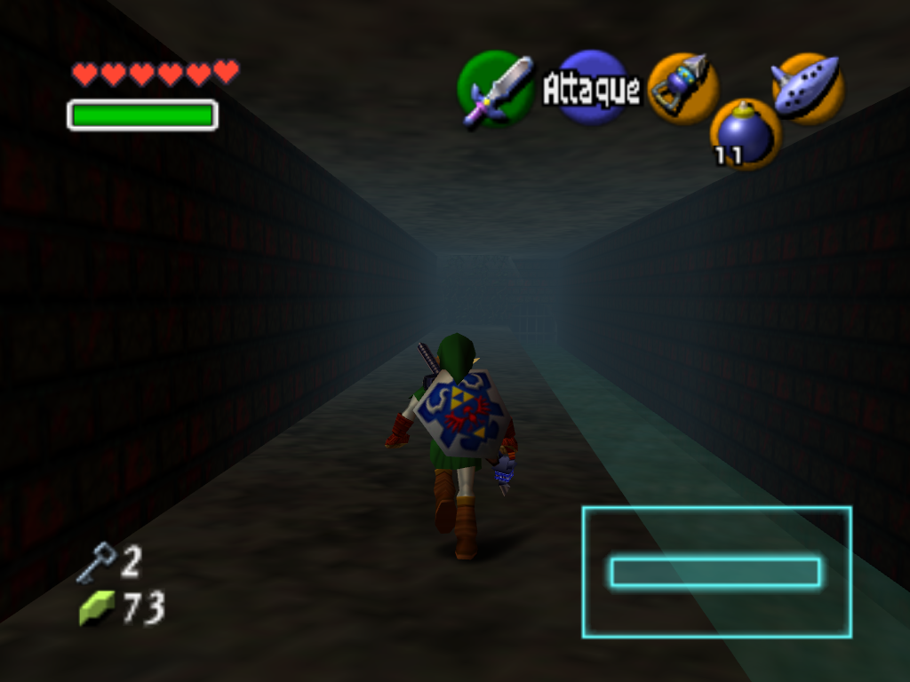 Maintenant, retournez dans la pièce juste avant le couloir tordu. Il y a une plaque grise au dessus de la porte, frappée d'un œil. Tirez une flèche dans cet œil, le couloir va se redresser. Retraversez-le et descendez tout de suite en bas. Ouvrez le beau coffre bleu et doré, il contient la Clé d'Or.