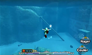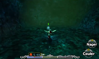 Imitez-le pour aller lui parler. On dirait qu'il vous connait... Il vous proposera un Flacon Vide si vous réussissez son challenge : remonter toute la rivière en traversant des anneaux. Lorsque le compte à rebours commence, vous êtes hors de l'eau, devant une sorte de plongeoir naturel derrière la cascade. C'est le moment d'apprendre à plonger : maintenez le bouton A et courez vers le rebord, vous ferez un plongeon digne des champions !