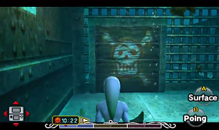 Progressez entre les grilles puis prenez l'ascenseur à bulles. Avancez prudemment au fond de l'eau pour éviter les mines et passer sous le courant. Si vous vous faites happer par le courant, vous vous retrouverez dans la piscine de l'entrée, et il faudra recommencer le parcours. Passez la porte en surface. Un coffre à Rubis Rouge vous attend dans l'eau devant vous, ainsi qu'un Rubis Bleu de l'autre côté de l'escalier, et un Fragment de Cœur dans une cage. Pour obtenir ce dernier, il faut monter les escaliers et casser les tonneaux pour trouver un interrupteur.