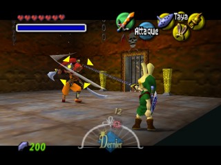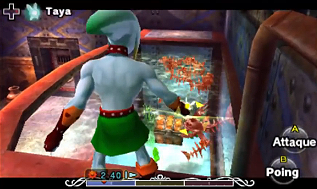 Cette fois, le Masque de la Pierre n'aura aucun effet, et de toute façon la pièce est fermée. Il faut donc lui rentrer dans le tas et, même si elle se défend plutôt bien, trois coups d'épée (ou quatre flèches, ou deux de feu, qu'elle tente d'esquiver) bien placés (juste avant qu'elle n'attaque ça passe bien) la mettront en fuite. Vous pouvez aussi la figer avec votre grappin, mais pour que ça marche, comme elle évite le coup, il faudra le lancer en feintant à bonne distance, le rappeler tout de suite puis le relancer, ou alors le lancer pendant qu'elle prépare son attaque.