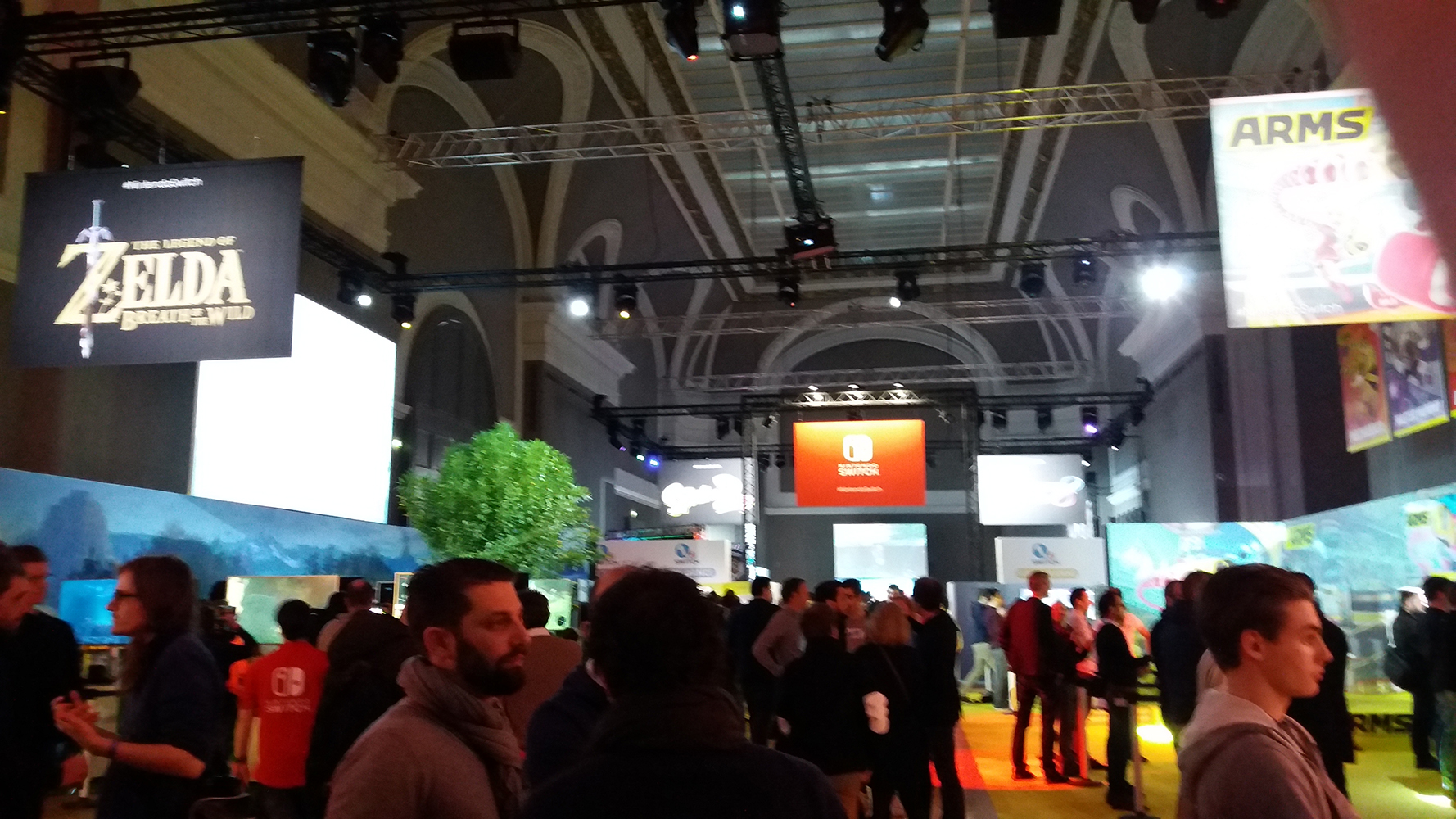 La première chose que l’on voit en entrant dans l’espace réservé au test est la disposition des stands. Sur la gauche de l’entrée, on peut voir le stand consacré à Zelda. L’espace dédié au test de Breath of the Wild occupe un quart de la superficie des stands de tous les autres jeux confondus. De plus, le stand Zelda est le seul à avoir un décor plus poussé que les autres : sol recouvert de tapis imitant l’herbe, troncs d’arbres en guise de sièges pour les personnes en train de tester le jeu… Avec l’immense écran géant au-dessus du stand diffusant en boucle le nouveau trailer, on comprend dès le début que la véritable star de la journée de présentation de la Nintendo Switch est The Legend of Zelda: Breath of the Wild. Cette impression se fait malgré un écran géant en direction de l’entrée diffusant le trailer de Super Mario Odyssey.